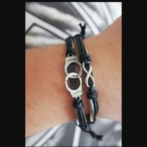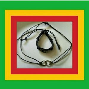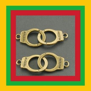 Let these two pieces remind you daily how important your FREEDOM is. Miniature handcuffs on leather & hemp adjustable waxed bracelet or copper and matching necklace. Silver or copper toned handcuffs. Necklace can be adjusted to be a choker.Only gold tone left.