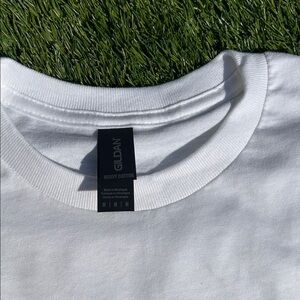 Classic white Gildan t-shirt. Made from heavy cotton. Comfortable and durable