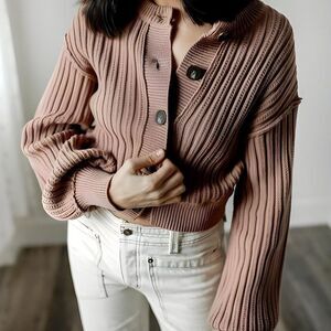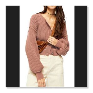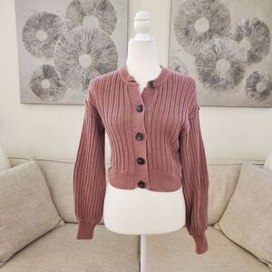 FM38 (tags: sweater, button up, button down, outerwear, cropped cardigan, cropped, sweater, crop, puff sleeve, ribbed, knit, women's size XS, size extra small