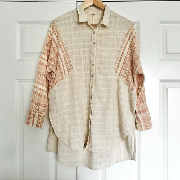 Great Shacket top from FREE PEOPLE! Size Small; worn once. Orange and cream/ivory + textured ivory. Cotton blend. Oversized fit