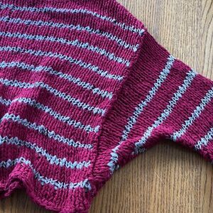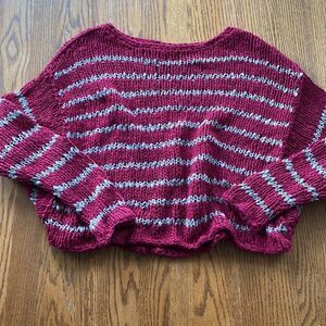 FREE PEOPLE Over Easy Striped Open Chunky Knit Sweater open weave knit. oversized fit. slim sleeves. pink-red with tan stripes. wide scoop neck. excellent condition ~~~ Chunky, transition, bright, colorful, layering, pink, red, beige FREE PEOPLE Over Easy Striped Open Knit Sweater