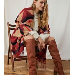 Make a statement in this oversized draped poncho featured in a bold, western-inspired colorful print with fringe ends and frayed detailing* Pullover style* Wide sleeves* Chunky woven design