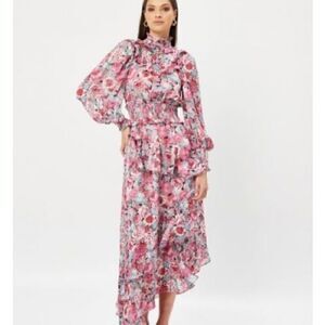 Printed to perfection, this so gorgeous maxi dress is featured in a femme, floral design with ruffle detailing, exaggerated sleeves, and smocked waistband for added shape.