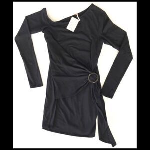 This fun little body-conscious dress features an adjustable cinch ring for shaping at the waist. Fit: this style fits true to size. - Slips on over head - Asymmetrical scooped neckline - Long sleeves - Unlined - Approx. 31" length (size M) - Imported