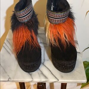 Spanish made suede platform ankle boots featuring multicolored faux fur and a woven band at the ankle with a crochet accented sole.