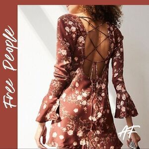 Femme and floral, this essential mini dress features a cowl-inspired neckline and belle-style sleeves with lace-up detail at back for added dimension.