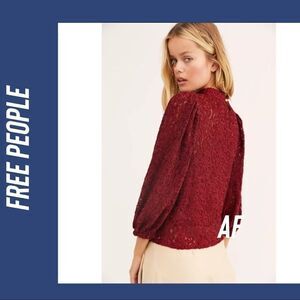 FREE PEOPLE MOCK NECK SHEER LACE BLOUSE WINE