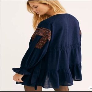 New Free People beaded and embroidered mini dress featured in a cross-front, babydoll-inspired silhouette with ruffle trim and adjustable drawstring waist detail. Color navy blue .