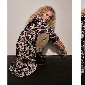 So stunning and the perfect layering piece, this duster is featured in a longline silhouette and velvety fabrication with a vintage-inspired floral print, collared neckline, and button front closure. * Long-sleeve style * Side slit at back * Side pockets