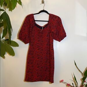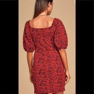 An abstract patterned mini dress with short puff sleeves.