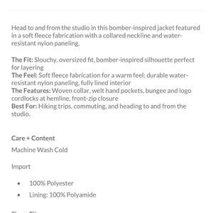 Head to and from the studio in this bomber-inspired jacket featured in a soft fleece fabrication with a collared neckline and water-resistant nylon paneling. Hiking trips, commuting, and heading to and from the studio.