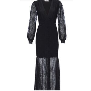 The perfect dress for any occasion, this gorgeous button-front gown is featured in a lace fabrication with exaggerated long sleeves and sheer bottom feature for added dimension. Empire waistline Button-closure sleeve cuffs Lined at bodice Elastic waistband for added shape Care/Import Dry Clean Only Made in the USA.