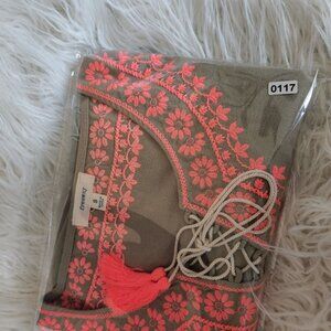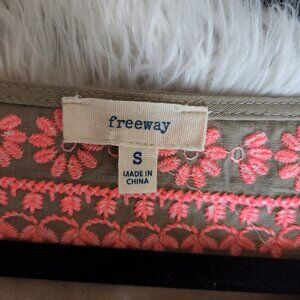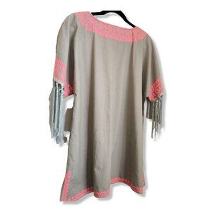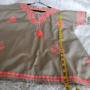FREEWAY Anthropologie Embroidered Bell Sleeve BOHO Top Sz S w/fringe & tasselsBeautiful Bohemian Top, by Freeway size Small 55%linen & 45% cotton blend, tan with Hot pink embroidered, fringe & tassels m, front has cross cross draw strings, boutique quality, very well made, Johnny was, Broken Arrow, T hread Logic, Pre-owned gently used, no damages, no stains, smoke free home.