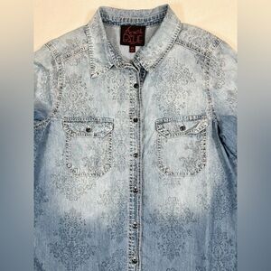 chambray, filigree, dip dye, ombre, two tone, filigree, denim, women's button downs, petite, trendy, women's fashion, retro, vintage style, grunge, patterned