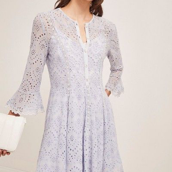 a perfectly romantic summer dress ends with this dress. Delicate broderie Anglaise runs throughout the dress, casting an intricate, eye-catching pattern. It has a flattering fit and flare shape with a form-fitting bodice with a central button-down panel for contouring, and lightly flared skirt. The fluted sleeves are finished with delicate lace, complementing the feminine look of the dress.