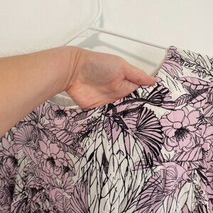 - lilac lavender purple / white / black floral and bird print round neck approx elbow length sleeve shift dress