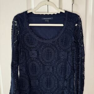 Classically chic, this French Connection lace dress captures timeless femininity. Featuring intricate crochet trim, a scalloped hem, and sheer long sleeves, the navy blue dress offers a refined yet effortless look. The scoop neckline and lined body balance sophistication with ease, making it perfect for various occasions.