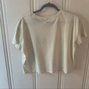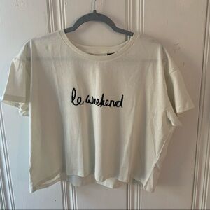 Life is better on the weekend! Add a little French chic to your wardrobe with this white body short sleeve cropped tee with “le weekend” printed on the front. 100% cotton. Size SMALL.