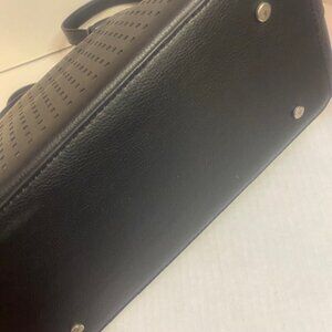 The FRENCH CONNECTION perforated Large black Leather tote bag is a stylish and versatile accessory for women. This rectangular tote features snap closure, double black handles with a 10-inch drop, and black hardware accents. The bag's exterior is crafted from leather with a solid pattern and perforated accents, adding a fashionable touch. With a spacious interior lined with black leather, this tote is perfect for travel, casual outings, workwear, or business meetings. The French Connection brand and the chic Marin model make this tote a must-have addition to any wardrobe. Great Condition