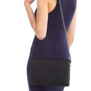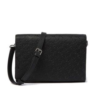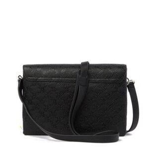 A faux leather allover logo detailed messenger bag with 3 separate compartments to stash your necessities and stay organized all at once. - Adjustable shoulder strap - Flap with magnetic button closure - Exterior features allover embossed(black) or printed logo detail - Interior features 2 compartments separated by 1 center zip compartment - Approx. 7" H x 10" W x 2" D - Approx. 19-23" strap drop - Imported