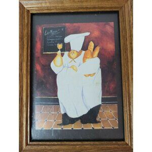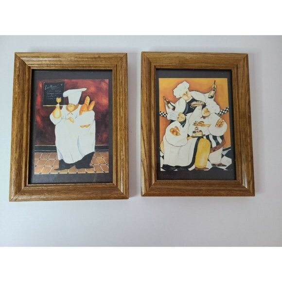 French Fat Chef Set of Two Wall Paintings Kitchen Dining Room Framed 6.5 X 8.2"