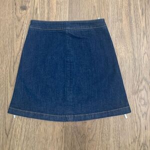 Denim mini skirt with metal double-end full-length side zippers Back darts for shape and fit. Size 4 but runs small in my own opinion. Worn twice. Like new