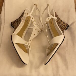 FRESCO BY PIERRE WHITE WITH GOLD STUDS, LEOPARD WEDGE SANDALS. NICELY PADDED INSOLE FOR COMFORT. NEW IN BOX. JUST SHY OF 4.5 INCHES.