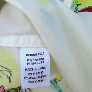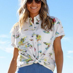 A colorfully beachy print on a woven creamy almost-white material and generously sized (check measurements below!), its your go-to short sleeve wardrobe staple in a fresh new playful print.