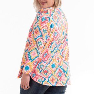 Done in the colorful MARRAKESH print on White, it is a midweight cotton slub material cut on the diagonal for a casual and stylishly versatile tunic top.
