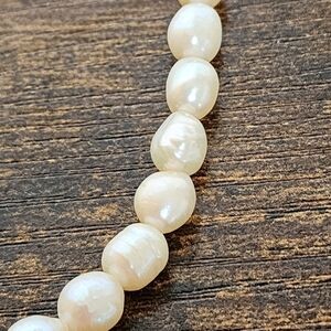 Creamy Iridescent and Pink clusters of wired freshwater pearls and mother of pearl layer to make up three cherry blossom style flowers, that merge into a strand of freshwater pearls, up to the sterling silver lobster clasp closure.