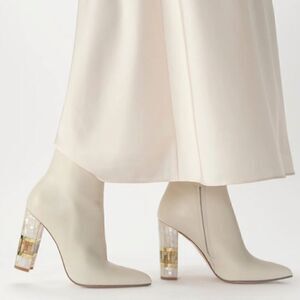 Part of our Iconic collection of contemporary jewelled heels, Jasmine is a luxurious white leather ankle boot featuring the Freya Rose signature jewelled heels; a statement high block heel boot handcrafted with genuine Mother of Pearl and polished brass.