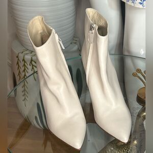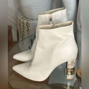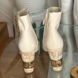 Jasmine White is a Unique Pointed Ankle Boot with Ornate Mother of Pearl Heel, expertly inlaid with Polished Brass. Handcrafted in Soft White Leather. Jasmine White is a beautifully wearable day-to-night boot, or a statement piece for the highly fashionable bride.