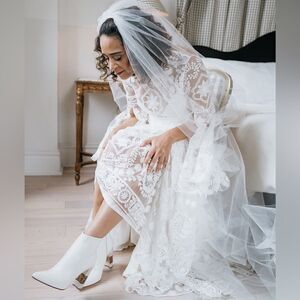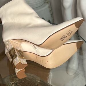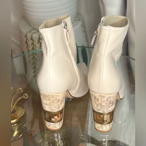 Jasmine White is a Unique Pointed Ankle Boot with Ornate Mother of Pearl Heel, expertly inlaid with Polished Brass. Handcrafted in Soft White Leather. Jasmine White is a beautifully wearable day-to-night boot, or a statement piece for the highly fashionable bride.