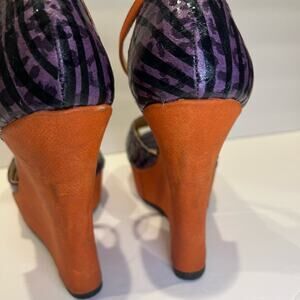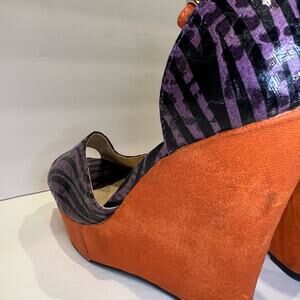 FRH statement wedge heels. Orange suede-like wedge heel with purple and black animal print shoe. In good used condition. Worn once. Wedge heel has some marks but can probably be buffed out.