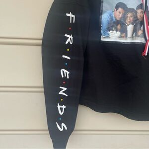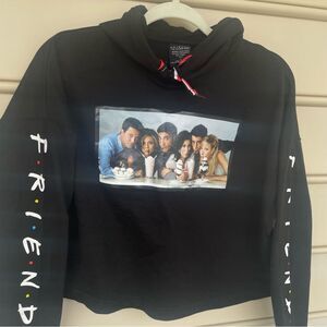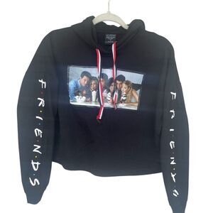 FRIENDS hoodie, cropped hoodie, graphic hoodie, black cropped hoodie, TV show hoodie, movie scene print hoodie, sleeve print hoodie, casual cropped sweatshirt, trendy hoodie, nostalgic TV merch, cozy hoodie, stylish hoodie
