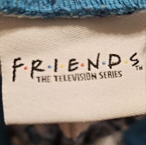 Experience cozy nights with these FRIENDS pajama bottoms, featuring a playful print on a white background and a light blue waistband. Crafted for comfort, they are perfect for lounging or sleeping.