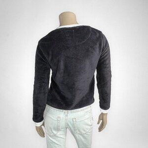 FRIENDS Central Perk coffee embroidered logo in front. Fuzzy texture. Sequined details. White and silver ribbed trim. Stretchy. Not lined.