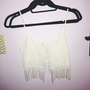 woven crop top with buttons down the front and fringe at bottom, super cute for festivals. from Bethany Mota brand at Aeropostale. never worn before :)