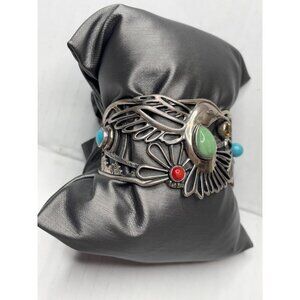 Details: FRITZ CASUSE X CAROLYN POLLACK Vintage Very Rare Multi Stone Sterling Silver Hummingbird Wide Cuff Bracelet