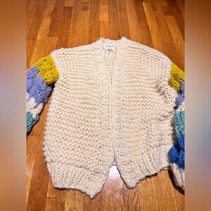 Chunky knit cardigan with vibrant sleeves. Features cream body with multicolor stripes on sleeves. Cozy and stylish.