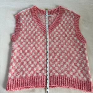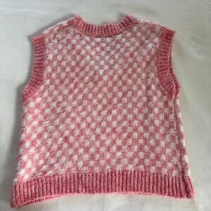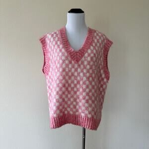 Chic sleeveless vest. Pink and white checkered pattern. Soft knit fabric. V-neck design.