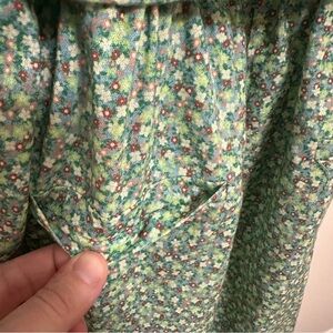Adorable modest but flirty floral short romper. Belted for defining waist, usable front pockets, button up front.