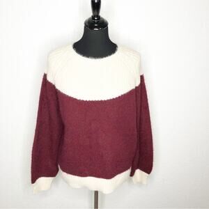 FRNCH cream maroon color block sweater. Pullover style with round neckline. Ribbed hemline and sleeve cuffs. Fuzzy knit. Size Medium / Large M/L. Excellent preowned condition. Minor wash wear.