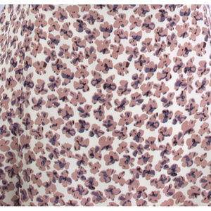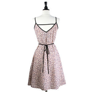 Off-white fit and flare dress with blush blossom print, v-neckline with black trim straps, black self-tie along the waist and strap across the back. Hidden side pockets and side zipper. Lined bottom half.