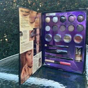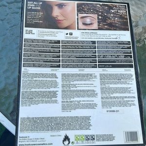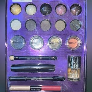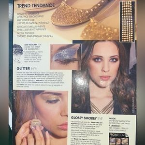 Features mascara. Satin, Iridescent, Glitter eyeshadows. Nail polish. Eye brush. Eye pencil. Lip stain gloss