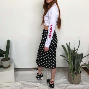 A little mermaid flair takes this polka dot midi skirt from classic to playful. She has great structure through the hips and falls into a soft silhouette. She's easy to dress up for the office and easy to dress down for weekend fun.