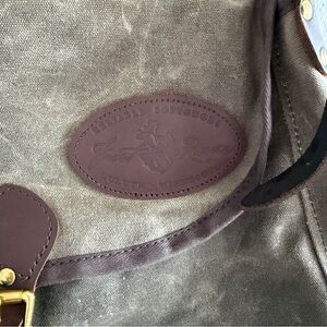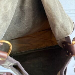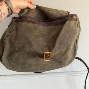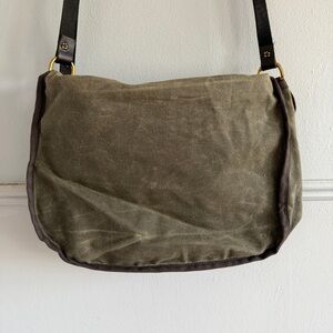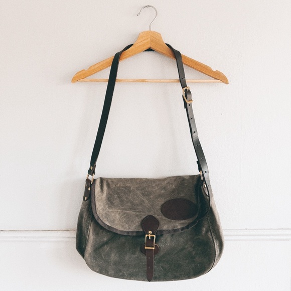Spacious main compartment and inner slip pocket. Leather Strap and buckle closure. Leather shoulder strap (adjustable). Waxed canvas. Solid brass hardware.