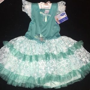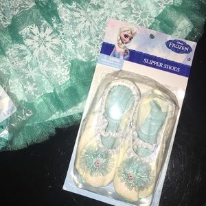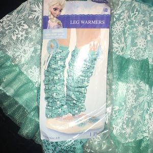 Get this just in time for your little one to visit Disney or play dress up to perform her favorite Frozen songs. Frozen dress, Elsa slippers, leg warmers and shrug sleeves.