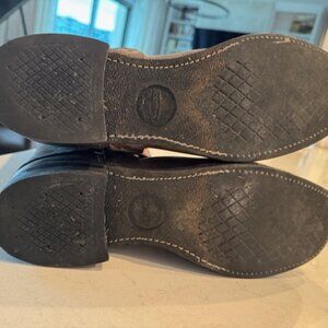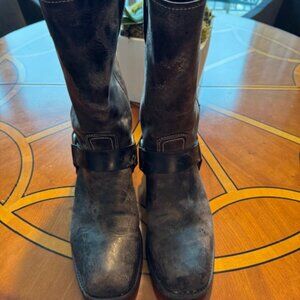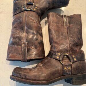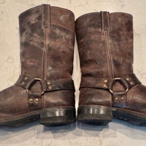 Rugged brown leather boots. Durable construction. Stylish buckle accents.