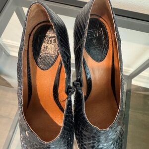 FRYE Ava Pump Snakeskin Black Ankle Boots with side Zip in Size 10. Pre loved but in excellent condition. Great shoe for fall/winter.